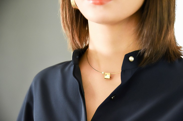 都会的でモードな印象のメタリックゴールドに、リングのグリーンストーンとチョーカーの1粒パールが女性らしい優しげな雰囲気をプラスします。