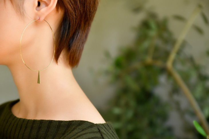 大振りのフープピアスとアンティークテイストのリングを重ね着け。