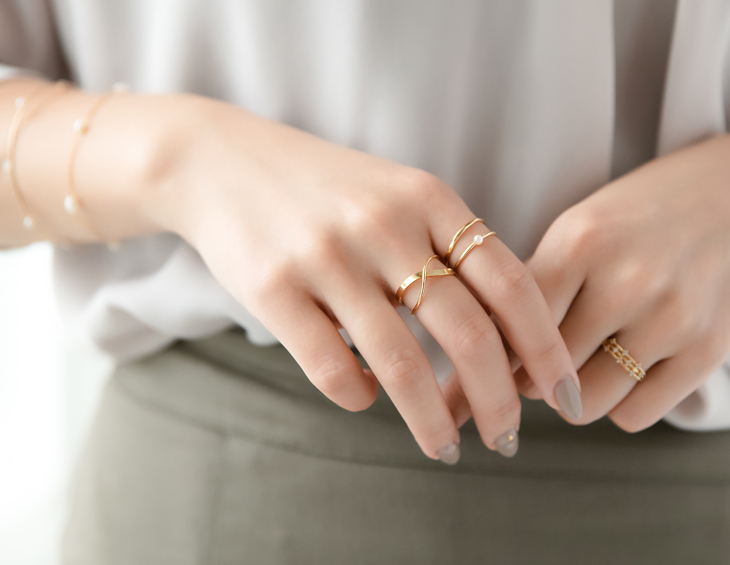 プチパールリングとシンプルなテスクチャーリングをコーディネートすればアーバンな印象もプラスされ、より洗練された手元に。