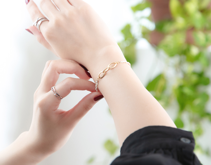 手元には重ね着けしたようなルックスの気品溢れるカフリングにあわせて、「永遠の愛の象徴」と言われるエタニティーラインと、