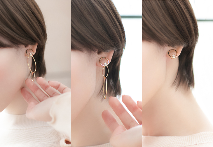小さめフープを上にすれば振り子のようにゆるやかに揺れ動きトレンドライクに、フープを取り外せばすっきりとして上品に仕上がります。