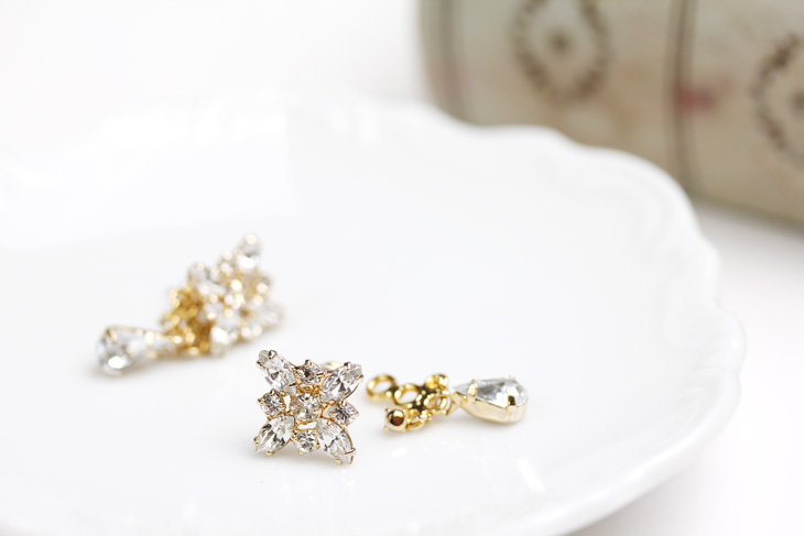 トレンドのビジューをふんだんに使った2WAYピアス。シャンデリアをイメージした動きのあるデザインはパーティースタイルをよりドレッシーに彩り、カジュアルなスタイルにも簡単にトレンド感を取り入れることが出来ます。