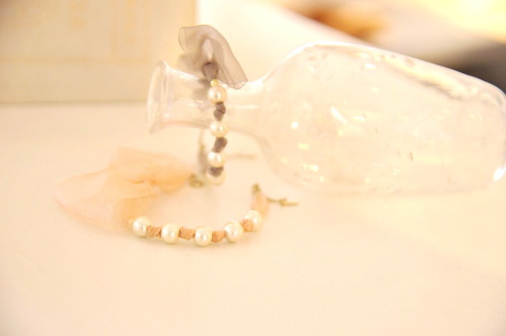 優しい風合いのコットンパールにオーガンジーの柔らかさがプラスされたガ―リーな仕上がりのブレスレット。 カラーをニュアンスカラーにしたことで甘さが抑えられ大人の女性にも楽しめるエレガントなデザインに。