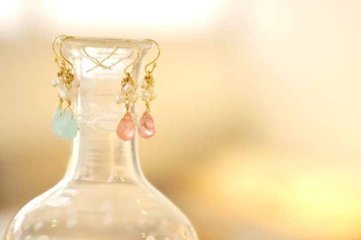 春らしい色のドロップ型ストーンを主役に小粒のパールを散りばめた女性らしいピアス。