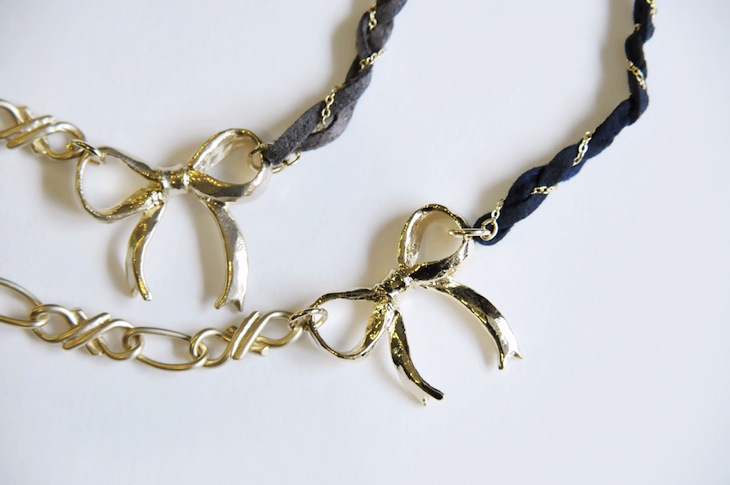 リボンをポイントにスエードとデザインチェーンをアシンメトリーにデザインしました。
