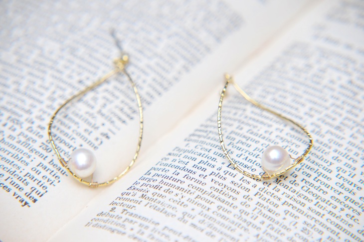 涙型の線形に1粒の淡水パールを添えたピアス。