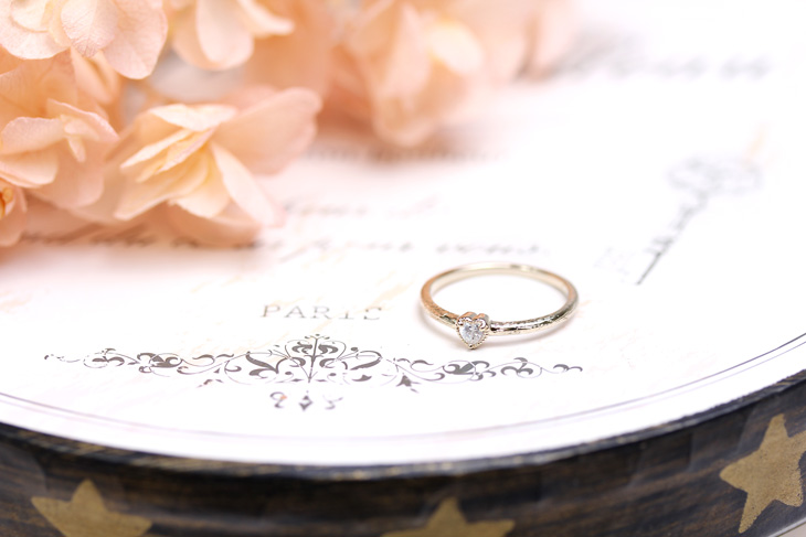 ハートシェイプの石と「Love」の刻印がフェミニンなリバーシブルリング。 つけ方によって見え方が変わるメッセージ性の高いデザインです。