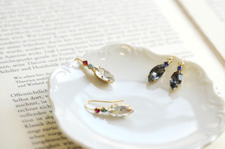 ビジューが優しく輝くマーキスシェイプのピアスは、エレガントな装いが大人っぽい仕上がりに。