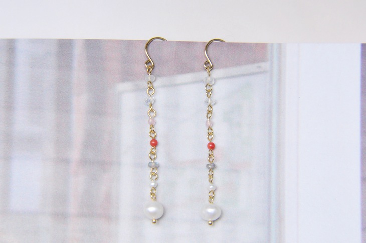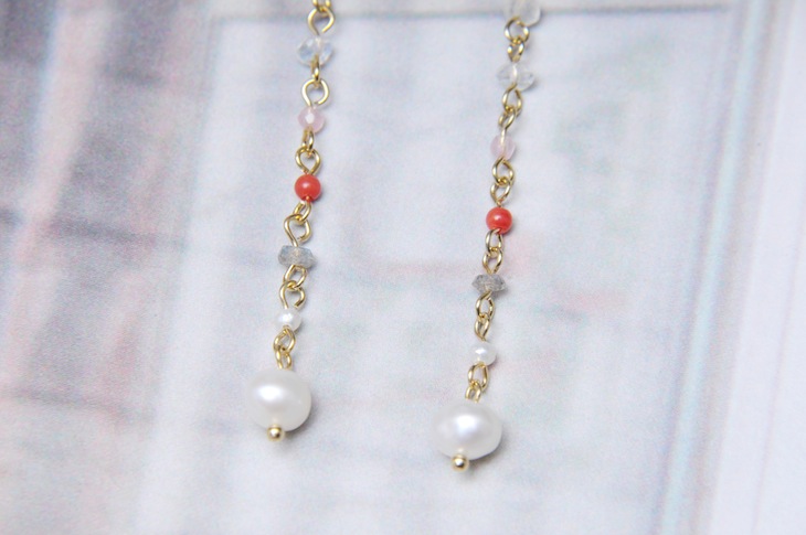 ピンク系のカラーストーンをグラデーションに配置したロングピアス。