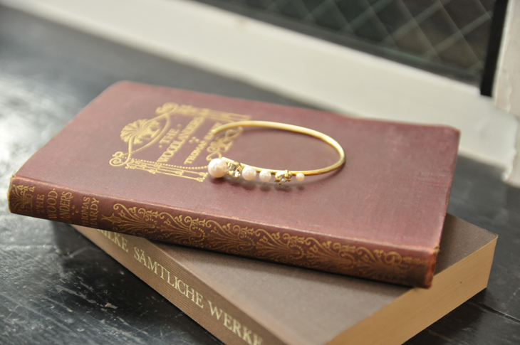 サイズに変化を持たせたパールとポイントに置いたビジューは、ボ トルからグラスに注ぐシャンパンをイメージしたデザイン。シンプルな中にも表情のあるシルエットは、1ランク上のオシャレを手元から 取り入れることができる、程よいボリューム感がつけやすいバングルです。