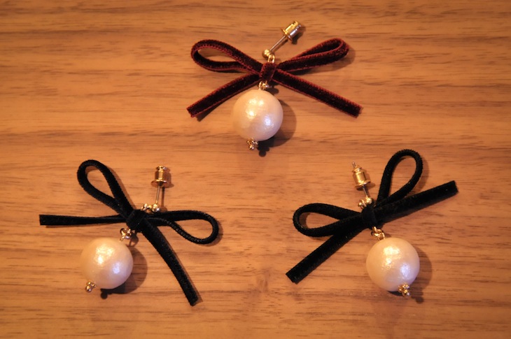 RIBBON PEARL EARRINGS – VELVET リボンパールピアスシリーズにショートサイズが登場。 コートやマフラーで襟元が隠れる秋冬ファッションに、耳元を彩るボリューミーでシックなデザイン。 甘いイメージのリボンをクラシックなベルベットの極細リボンを使用し、ビターに仕上げ大人の女性でもつけやすく。 ゴールドフラワーピンで留めたパールは、程よい大きさで顔の輪郭をきれいに見せます。 これからの季節にぴったりな落ち着いたダークカラーと、優しいパウダーカラーの2ライン展開。