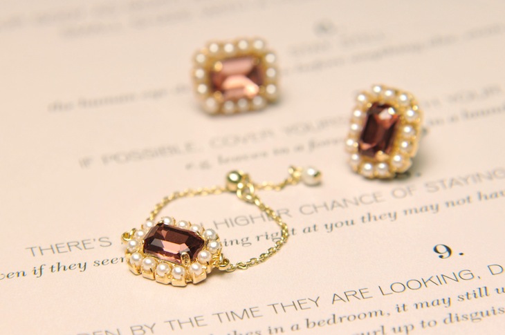 VINTAGE GLASS PIERCE & RING ヴィンテージライクなスタッドピアスと、スライドチェーンのリング。 オリジナルカットのガラスを使用し、クラシックなデザインに仕上げました。 ON/OFF問わずAWコーディネートにプラスできるアイテムです。 同シリーズでブレスレット・ネックレスの展開もあるので、トータルコーデを楽しんで。 BUY