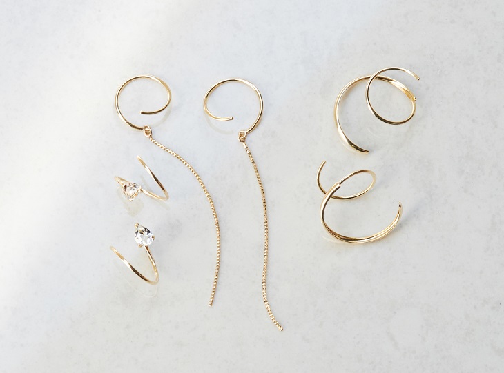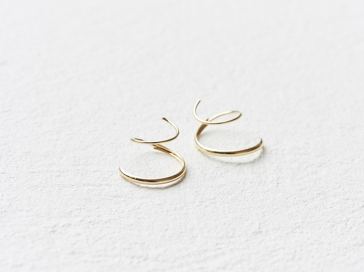 ホールにピアスを通して先端が耳たぶの前に回り込むまでくるくる回し続けると、まるで2つのピアスをレイヤードしたようなシルエットに。