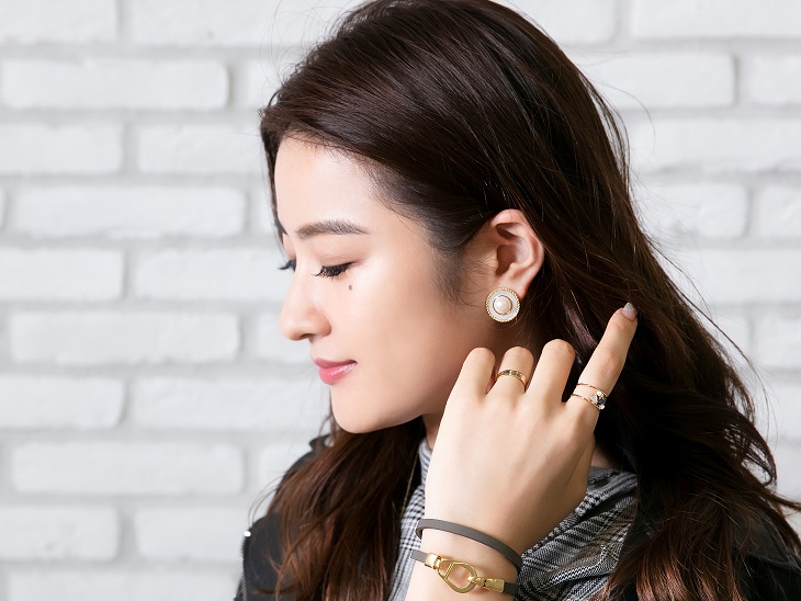 イヤリングに施されたゴールドメタルが輝きのアクセントとなり、上質感をアップ。手元コーデをゴールドカラーで統一すると、こなれ感のあるコーデが完成します。