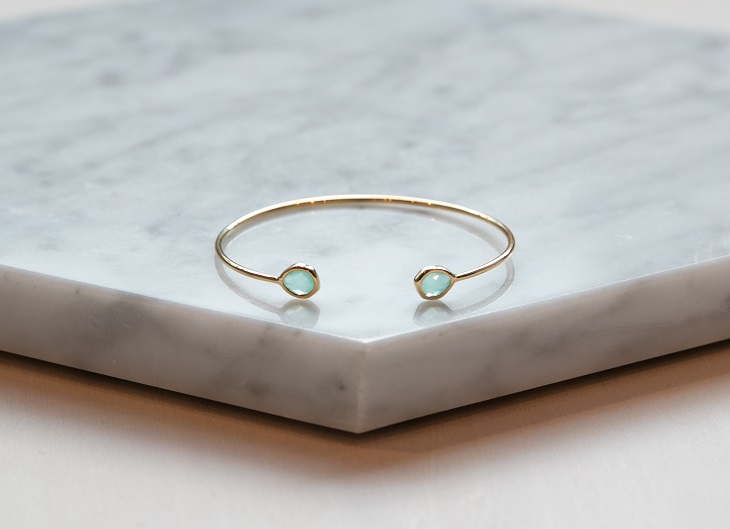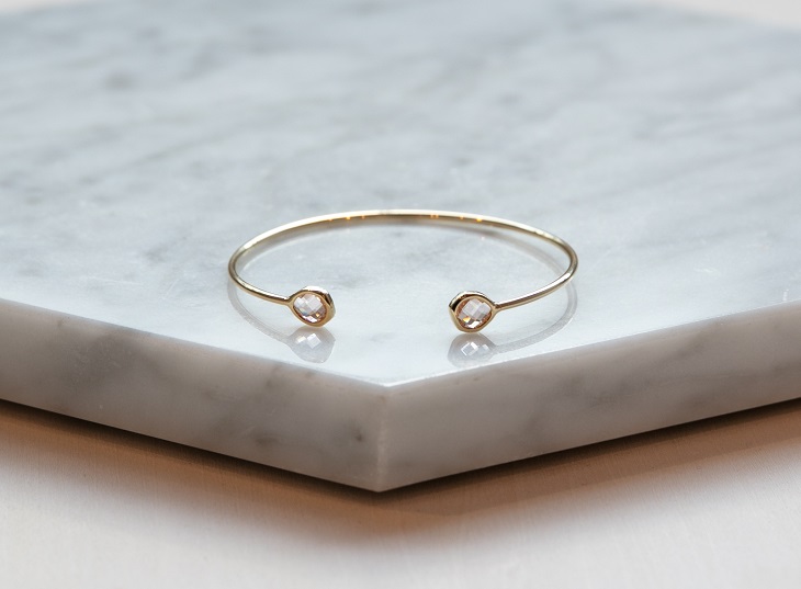 細みのバングルと、透き通るストーンが女性らしい手元を演出してくれます。